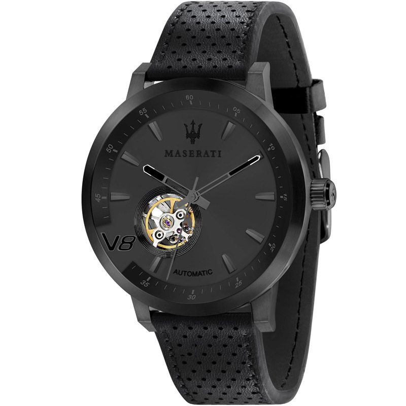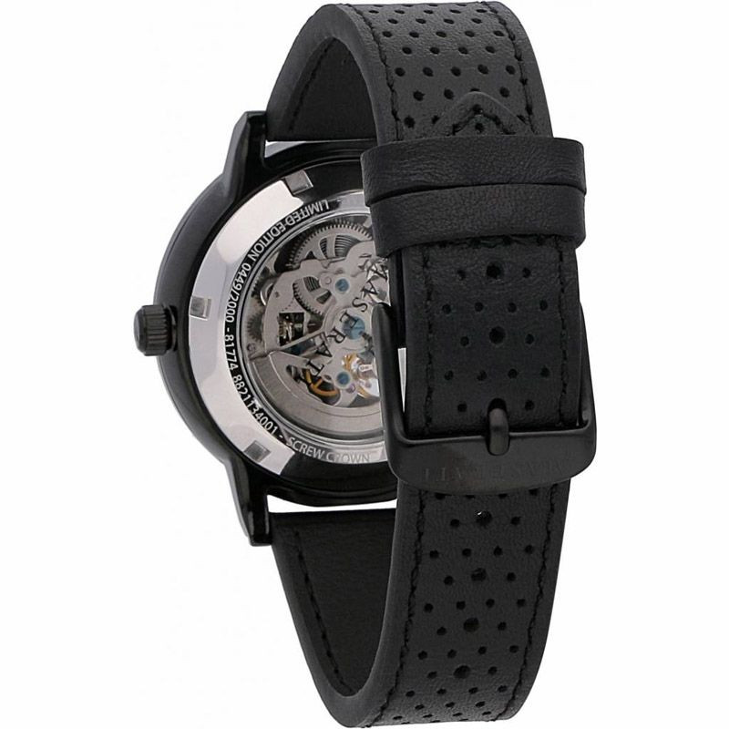 A Maserati Granturismo férfi karóra R8821134001 karóra házának anyaga Nemesacél, színe Fekete, a szíjának anyaga Bőr és a színe Fekete. Az óratok átmérője 44 mm, alakja Kerek. A karóra üvege Kristály (nehezen karcolható), szerkezete Automata és vízállósága 10 atm (100m) (úszásra is alkalmas).