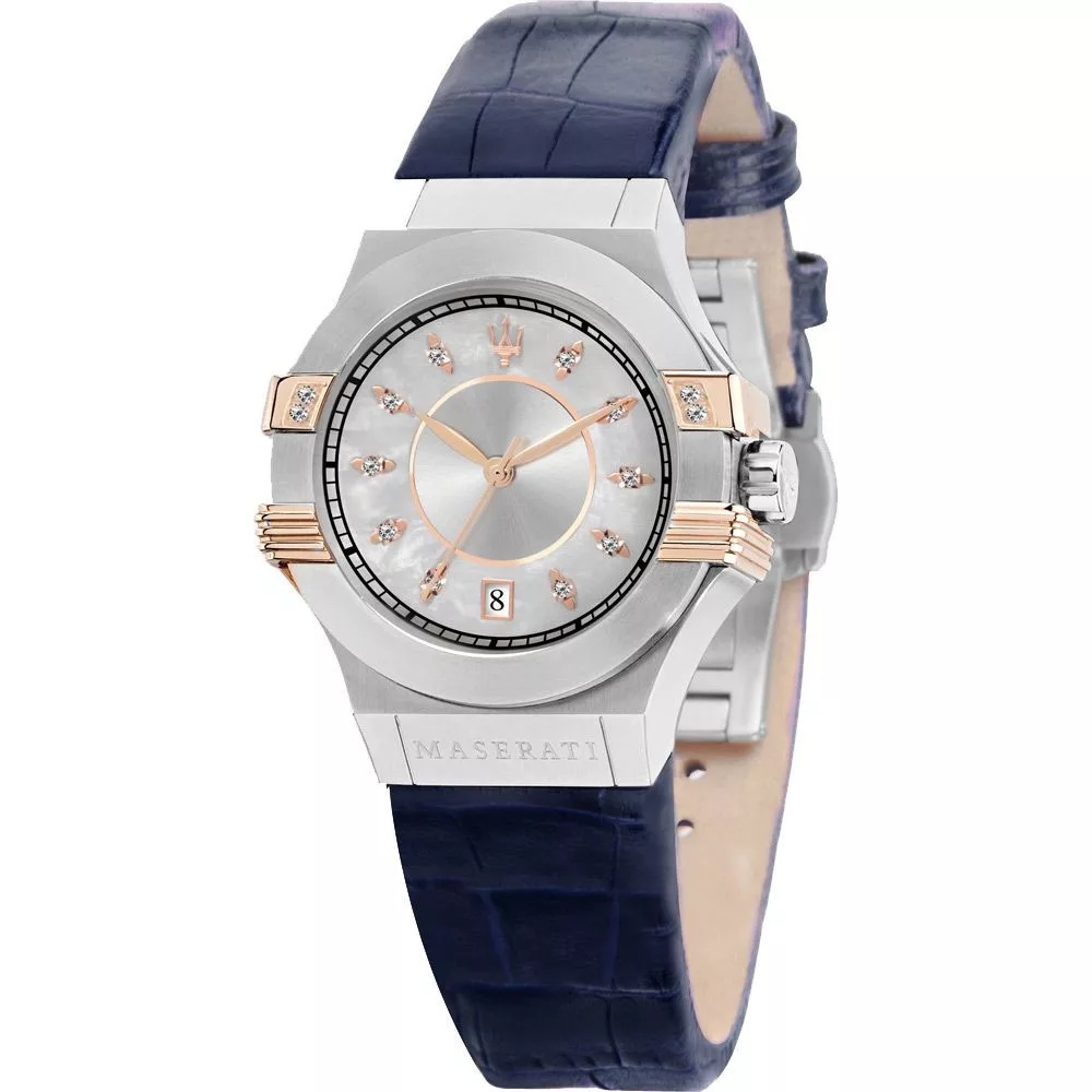A Maserati Potenza női karóra R8851108502 karóra házának anyaga Nemesacél, színe Ezüst, a szíjának anyaga Bőr és a színe Kék. Az óratok átmérője 35 mm, alakja Kerek. A karóra üvege Kristály (nehezen karcolható), szerkezete Kvarc és vízállósága 10 atm (100m) (úszásra is alkalmas).