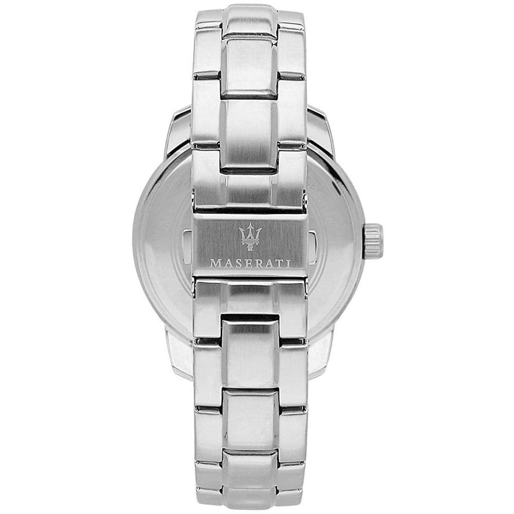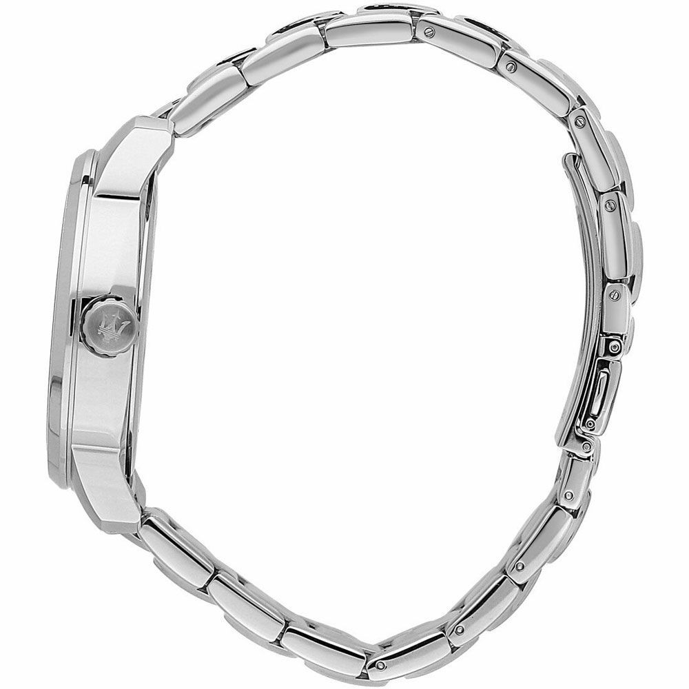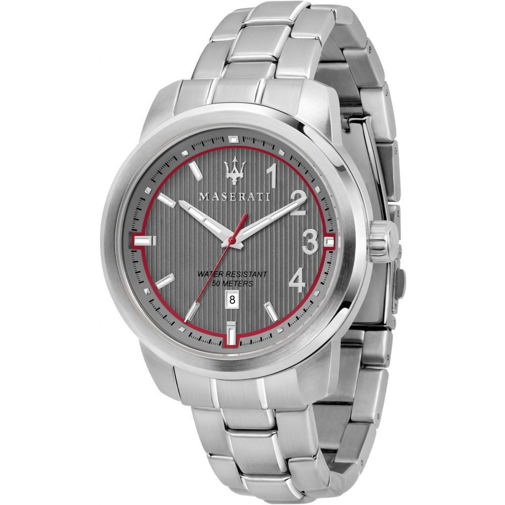 A Maserati Royale férfi karóra R8853137002 karóra házának anyaga Nemesacél, színe Ezüst, a szíjának anyaga Nemesacél és a színe Ezüst. Az óratok átmérője 45 mm, alakja Kerek. A karóra üvege Kristály (nehezen karcolható), szerkezete Kvarc és vízállósága 5 atm (50m) (erősen cseppálló).
