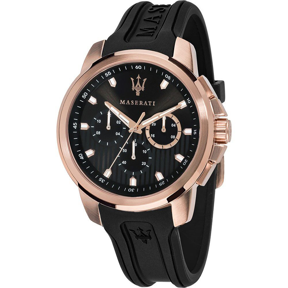 A Maserati Sfida férfi karóra R8851123008 karóra házának anyaga Nemesacél, színe Rose gold, a szíjának anyaga Szilikon és a színe Fekete. Az óratok átmérője 44 mm, alakja Kerek. A karóra üvege Kristály (nehezen karcolható), szerkezete Kvarc és vízállósága 5 atm (50m) (erősen cseppálló).
