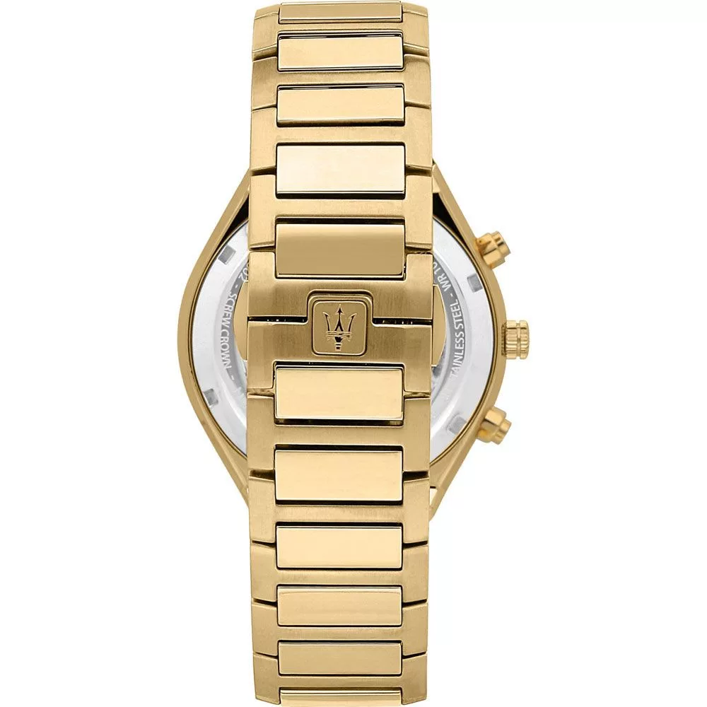 A Maserati Stile férfi karóra R8873642001 karóra házának anyaga Nemesacél, színe Arany, a szíjának anyaga Nemesacél és a színe Arany. Az óratok átmérője 45 mm, alakja Kerek. A karóra üvege Kristály (nehezen karcolható), szerkezete Kvarc és vízállósága 10 atm (100m) (úszásra is alkalmas).