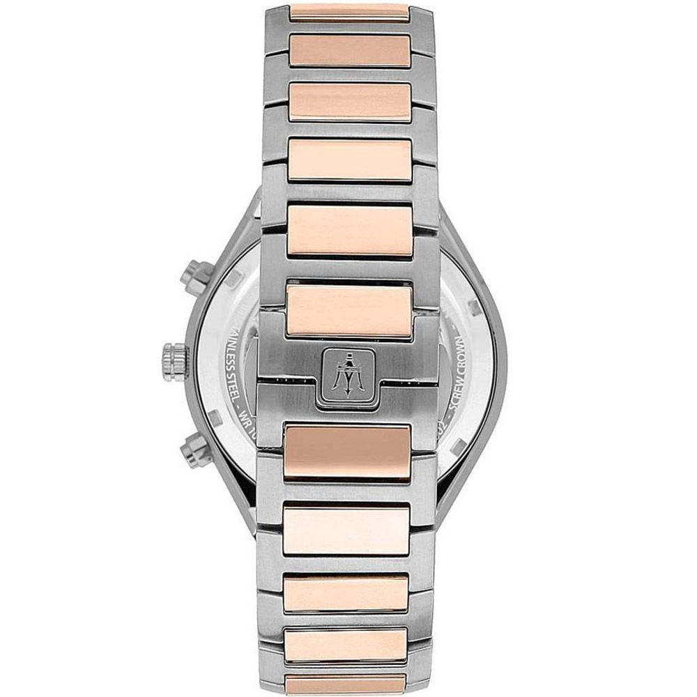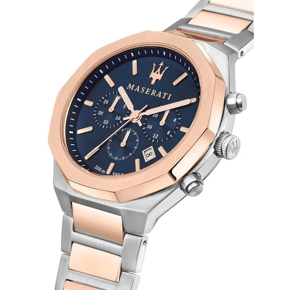 A Maserati Stile férfi karóra R8873642002 karóra házának anyaga Nemesacél, színe Ezüst,Rose gold, a szíjának anyaga Nemesacél és a színe Ezüst,Rose gold. Az óratok átmérője 46 mm, alakja Kerek. A karóra üvege Kristály (nehezen karcolható), szerkezete Kvarc és vízállósága 10 atm (100m) (úszásra is alkalmas).