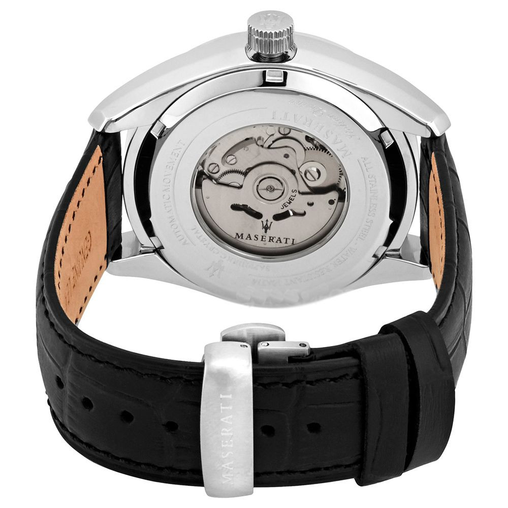 A Maserati Traguardo férfi karóra R8821112004 karóra házának anyaga Nemesacél, színe Ezüst, a szíjának anyaga Bőr és a színe Fekete. Az óratok átmérője 45 mm, alakja Kerek. A karóra üvege Kristály (nehezen karcolható), szerkezete Automata és vízállósága 10 atm (100m) (úszásra is alkalmas).