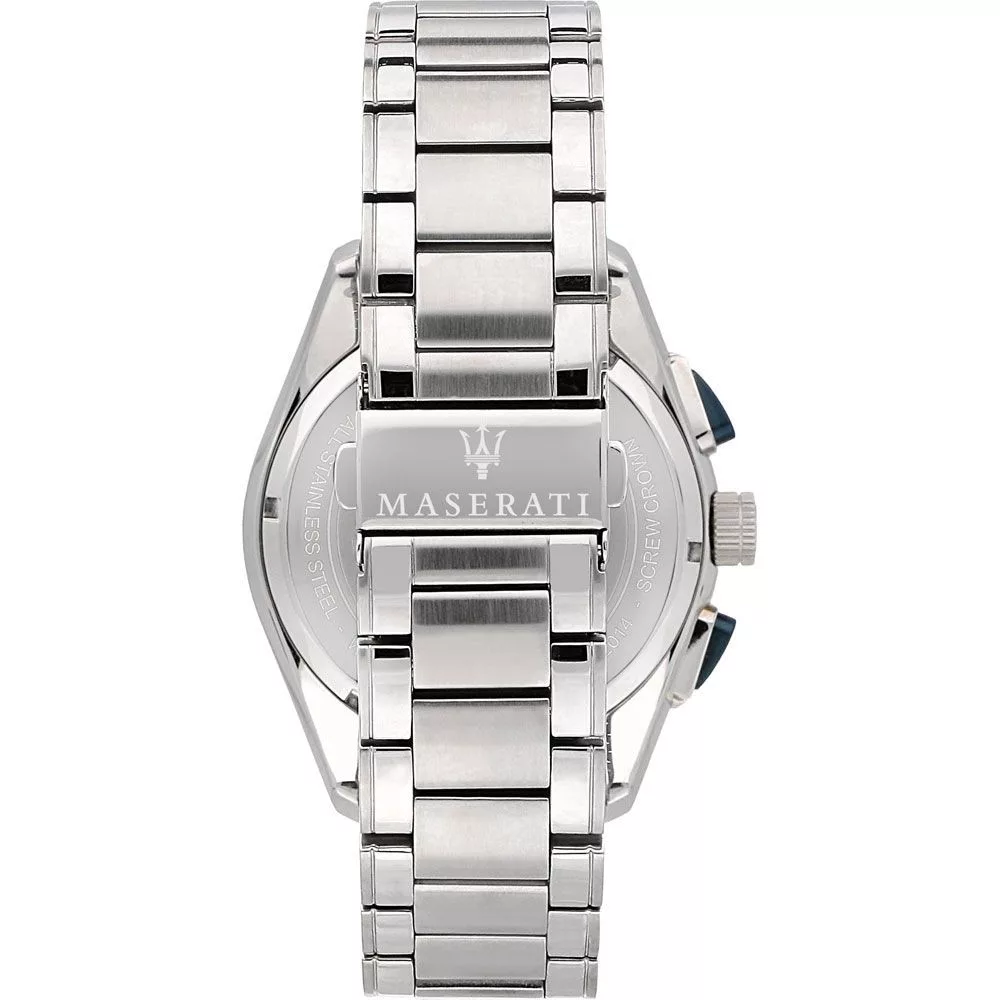 A Maserati Traguardo férfi karóra R8873612014 karóra házának anyaga Nemesacél, színe Ezüst, a szíjának anyaga Nemesacél és a színe Ezüst. Az óratok átmérője 45 mm, alakja Kerek. A karóra üvege Kristály (nehezen karcolható), szerkezete Kvarc és vízállósága 10 atm (100m) (úszásra is alkalmas).
