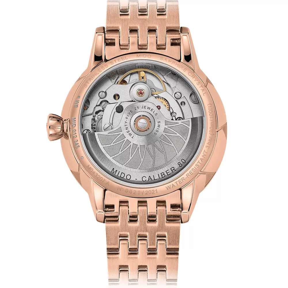 A Mido Rainflower Limited Edition női karóra szett M043.207.33.109.00 karóra házának anyaga Nemesacél, színe Rose gold, a szíjának anyaga Nemesacél,Bőr és a színe Fehér,Rose gold. Az óratok átmérője 34 mm, alakja Kerek. A karóra üvege Zafír (karcolásmentes), szerkezete Kvarc és vízállósága 3 atm (30m) (cseppmentes).