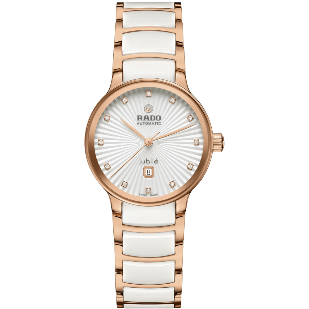 A Rado Centrix Automatic Diamonds női karóra R30019744 karóra házának anyaga nemesacél, színe rose gold, a szíjának anyaga nemesacél és a színe rose gold. Az óratok átmérője 30 mm, alakja kerek. A karóra üvege zafír (karcolásmentes), szerkezete automata és vízállósága 5 atm (50m) (erősen cseppálló).