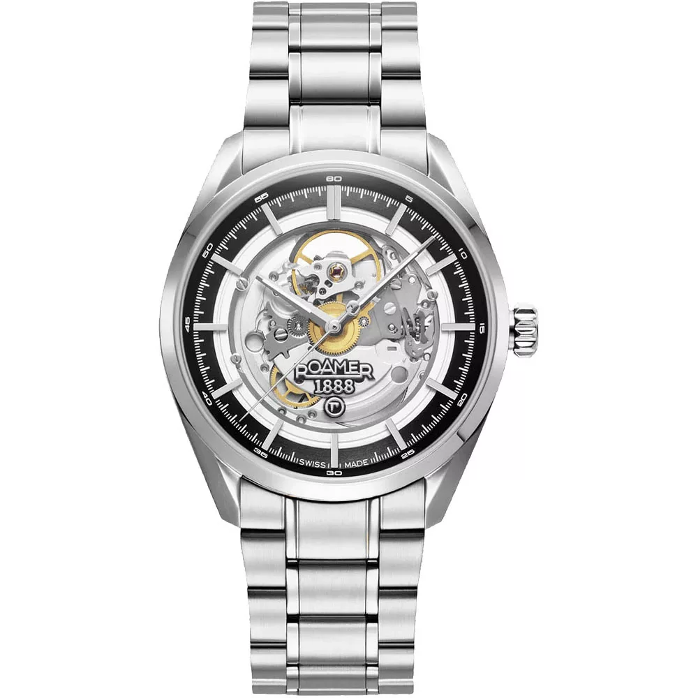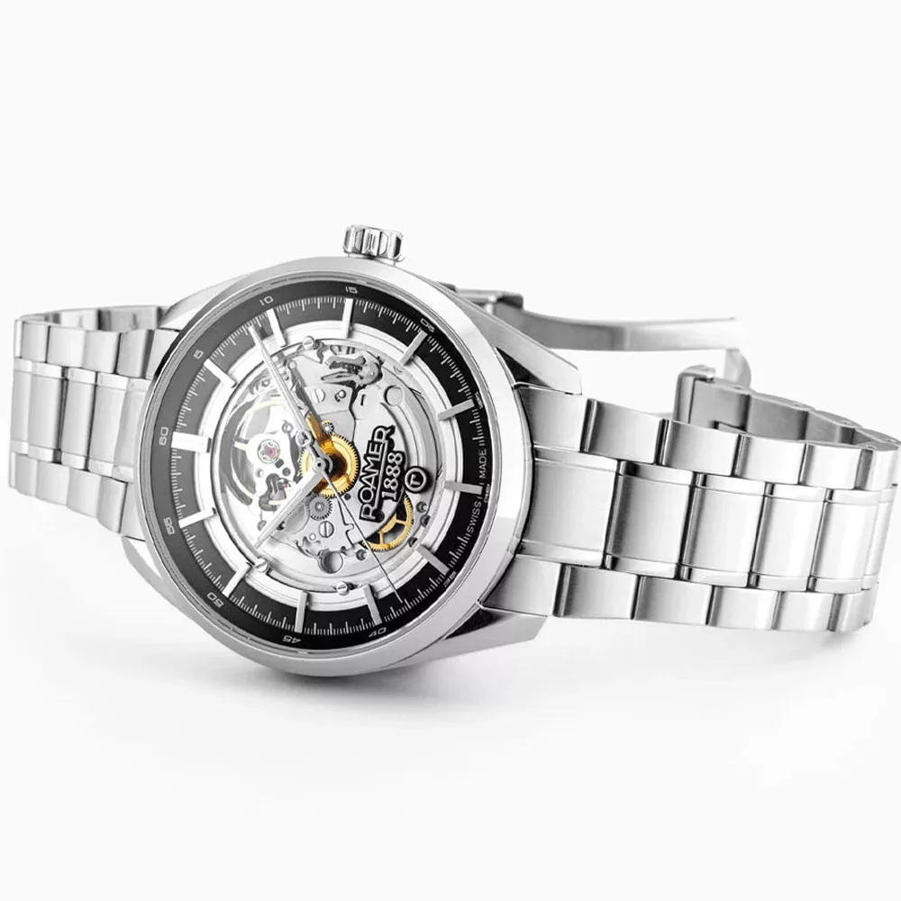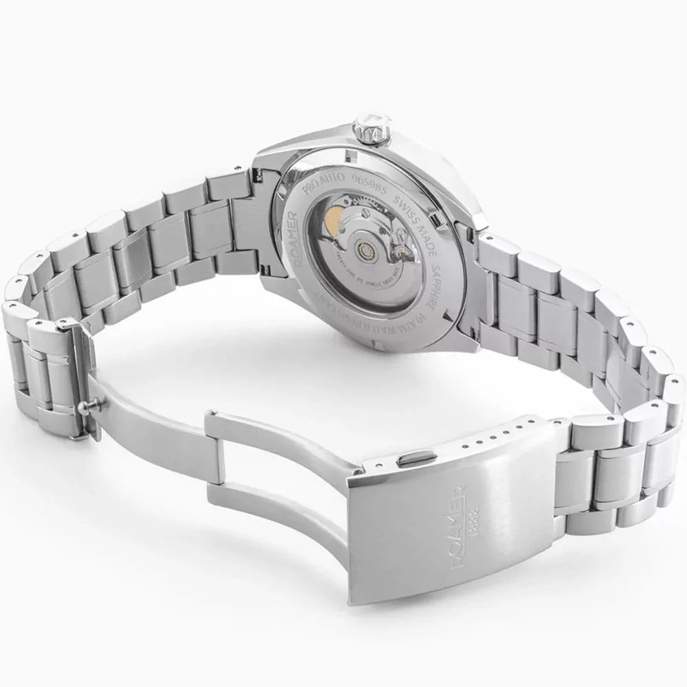 A Roamer Pro Auto férfi karóra 965985 41 85 20 karóra házának anyaga nemesacél, színe ezüst, a szíjának anyaga nemesacél és a színe ezüst. Az óratok átmérője 42 mm, alakja kerek. A karóra üvege zafír (karcolásmentes), szerkezete automata és vízállósága 10 atm (100m) (úszásra is alkalmas).