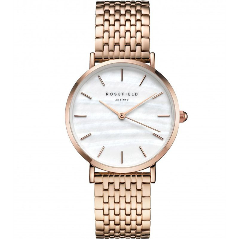 A Rosefield The Upper East Side női karóra UEWR-U20 karóra házának anyaga Fémötvözet, színe Rose gold, a szíjának anyaga Nemesacél és a színe Rose gold. Az óratok átmérője 33 mm, alakja Kerek. A karóra üvege Kristály (nehezen karcolható), szerkezete Kvarc és vízállósága 3 atm (30m) (cseppmentes).