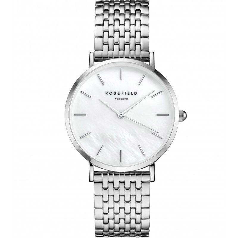 A Rosefield The Upper East Side női karóra UEWS-U22 karóra házának anyaga Fémötvözet, színe Ezüst, a szíjának anyaga Nemesacél és a színe Ezüst. Az óratok átmérője 33 mm, alakja Kerek. A karóra üvege Kristály (nehezen karcolható), szerkezete Kvarc és vízállósága 3 atm (30m) (cseppmentes).