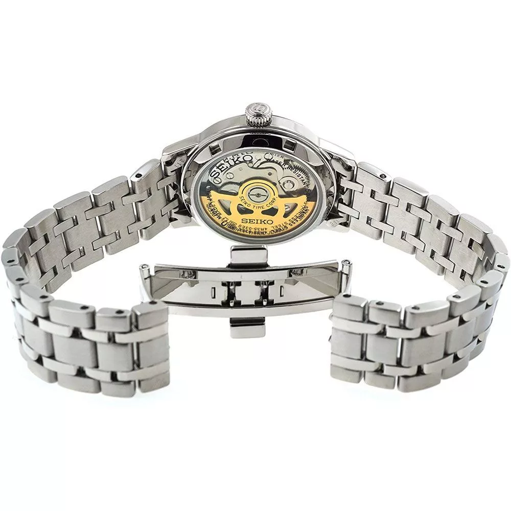 A Seiko Presage Cocktail Pink Lady női karóra SRP839J1 karóra házának anyaga Nemesacél, színe Ezüst, a szíjának anyaga Nemesacél és a színe Ezüst. Az óratok átmérője 34 mm, alakja Kerek. A karóra üvege Kristály (nehezen karcolható), szerkezete Automata és vízállósága 5 atm (50m) (erősen cseppálló).