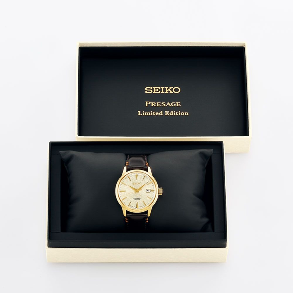 A Seiko Presage Cocktail Time Houjou Limited Edition férfi karóra SRPH78J1 karóra házának anyaga Nemesacél, színe Arany, a szíjának anyaga Bőr és a színe Barna. Az óratok átmérője 41 mm, alakja Kerek. A karóra üvege Zafír (karcolásmentes), szerkezete Automata és vízállósága 5 atm (50m) (erősen cseppálló).
