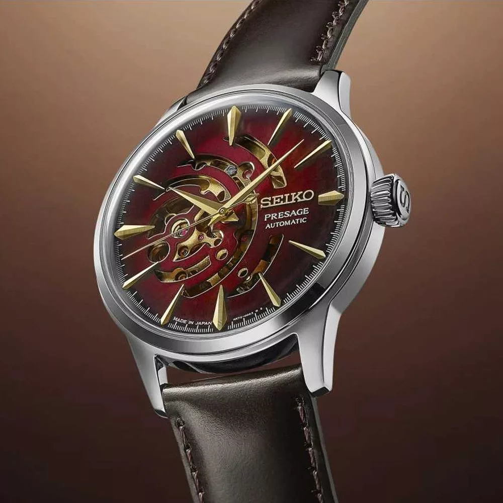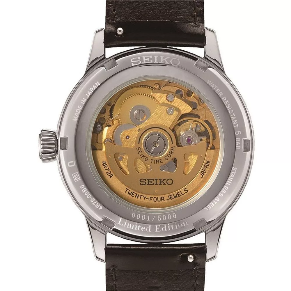 A Seiko Presage Cocktail Time Star Bar Limited Edition férfi karóra SSA457J1 karóra házának anyaga Nemesacél, színe Ezüst, a szíjának anyaga Bőr és a színe Barna. Az óratok átmérője 40 mm, alakja Kerek. A karóra üvege Kristály (nehezen karcolható), szerkezete Automata és vízállósága 5 atm (50m) (erősen cseppálló).