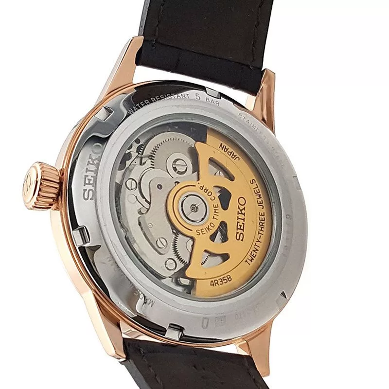 A Seiko Presage férfi karóra SRPB46J1 karóra házának anyaga Nemesacél, színe Rose gold, a szíjának anyaga Bőr és a színe Barna. Az óratok átmérője 41 mm, alakja Kerek. A karóra üvege Kristály (nehezen karcolható), szerkezete Automata és vízállósága 5 atm (50m) (erősen cseppálló).