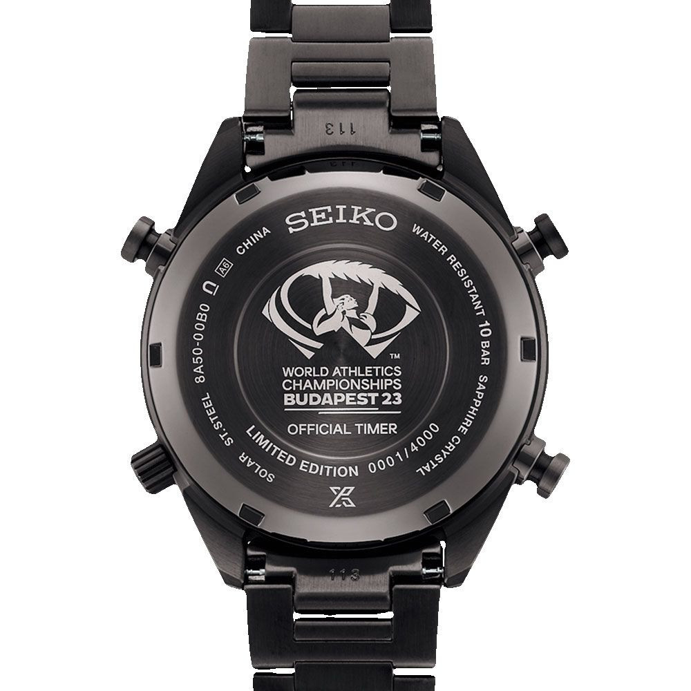 A Seiko Prospex World Athletics Championships Budapest 2023 Limited Edition Speedtimer férfi karóra SFJ007P1 karóra házának anyaga Nemesacél, színe Fekete, a szíjának anyaga Nemesacél és a színe Fekete. Az óratok átmérője 42 mm, alakja Kerek. A karóra üvege Zafír (karcolásmentes), szerkezete Solar és vízállósága 10 atm (100m) (úszásra is alkalmas).