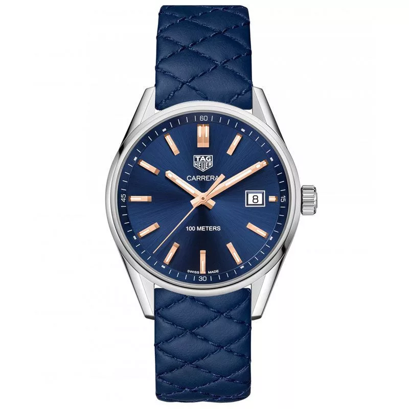 A Tag Heuer Carrera női karóra WAR1112.FC6391 karóra házának anyaga Nemesacél, színe Ezüst, a szíjának anyaga Bőr és a színe Kék. Az óratok átmérője 39 mm, alakja Kerek. A karóra üvege Zafír (karcolásmentes), szerkezete Kvarc és vízállósága 10 atm (100m) (úszásra is alkalmas).