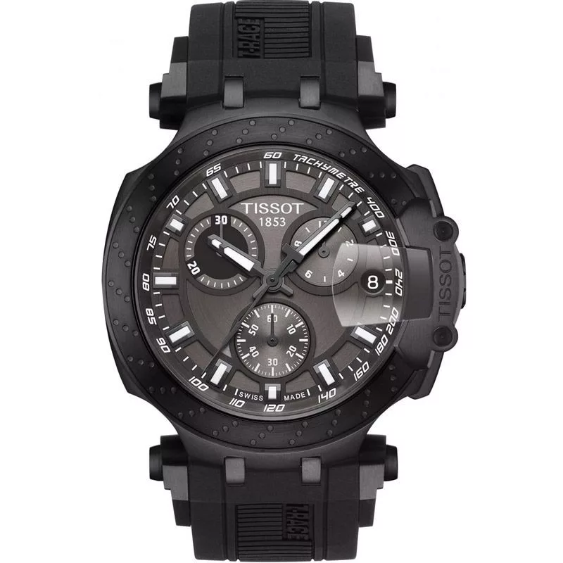 A Tissot T-Sport T-Race Chronograph férfi karóra T115.417.37.061.03 karóra házának anyaga Nemesacél, színe Szürke, a szíjának anyaga Szilikon és a színe Fekete. Az óratok átmérője 43 mm, alakja Kerek. A karóra üvege Zafír (karcolásmentes), szerkezete Kvarc és vízállósága 10 atm (100m) (úszásra is alkalmas).