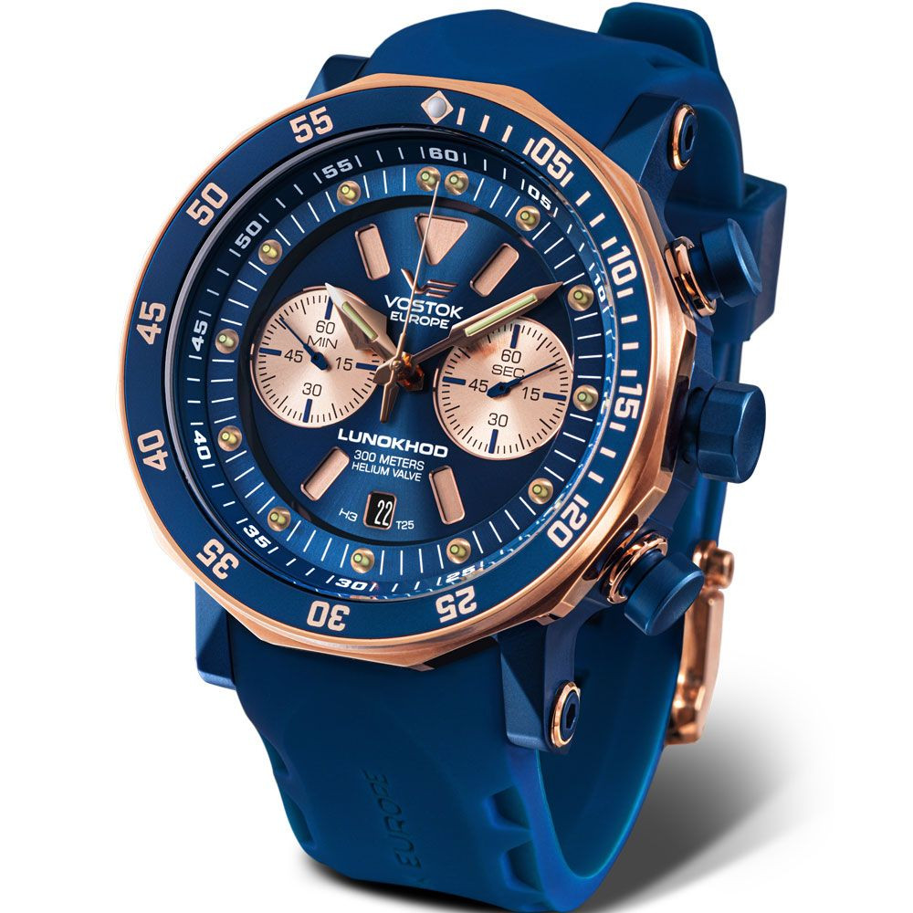 A Vostok Europe Lunokhod II férfi karóra 6S21-620E631 karóra házának anyaga Nemesacél, színe Kék,Rose gold, a szíjának anyaga Szilikon,Bőr és a színe Kék. Az óratok átmérője 49 mm, alakja Kerek. A karóra üvege Kristály (nehezen karcolható), szerkezete Kvarc és vízállósága 20 atm (200m) (búvárkodásra is alkalmas).