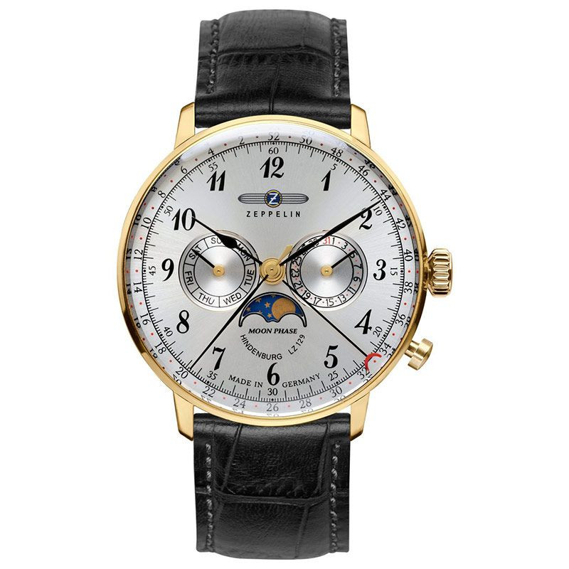 A Zeppelin LZ 129 Hindenburg férfi karóra 7038-1 karóra házának anyaga Nemesacél, színe Arany, a szíjának anyaga Bőr és a színe Fekete. Az óratok átmérője 40 mm, alakja Kerek. A karóra üvege Kristály (nehezen karcolható), szerkezete Kvarc és vízállósága 3 atm (30m) (cseppmentes).