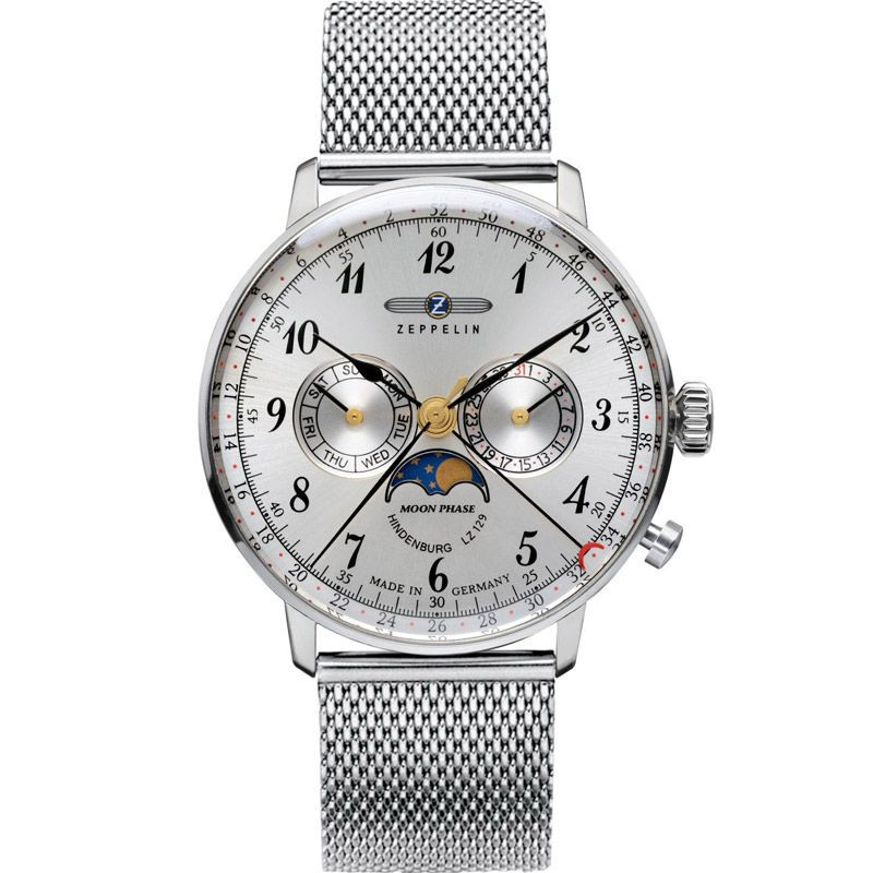 A Zeppelin LZ129 Hindenburg férfi karóra 7036M-1 karóra házának anyaga Nemesacél, színe Ezüst, a szíjának anyaga Nemesacél és a színe Ezüst. Az óratok átmérője 40 mm, alakja Kerek. A karóra üvege Kristály (nehezen karcolható), szerkezete Kvarc és vízállósága 3 atm (30m) (cseppmentes).
